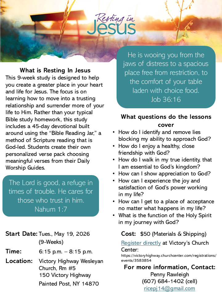 Resting in JesusVictory Highway Wesleyan Church (Rm 4) | 150 Victory Highway | Painted PostTuesdays: 6:15 PMStart Date: May 19th, 2026Contact: Penny Rice |