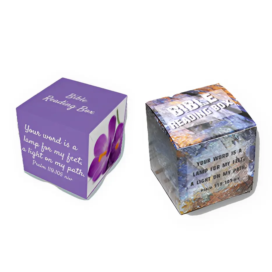 The Bible Reading Box comes with a 3″ x 3″ square box, instructions, and all the books of the Bible on a perforated page for easy separating.