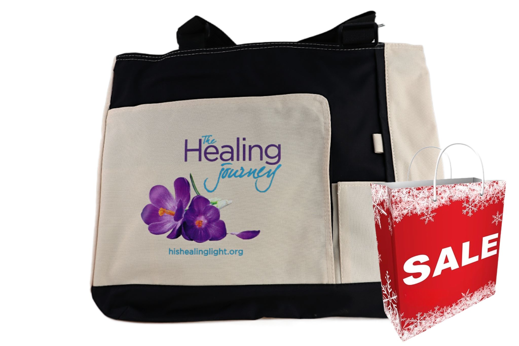 This 18” x 15” bag features the Healing Journey logo, a large zippered compartment, a smaller zippered compartment in the front, a pocket for phone or glasses, and a loop for a pen. The woven handles adjust for carrying on the shoulder or arm. Washable.