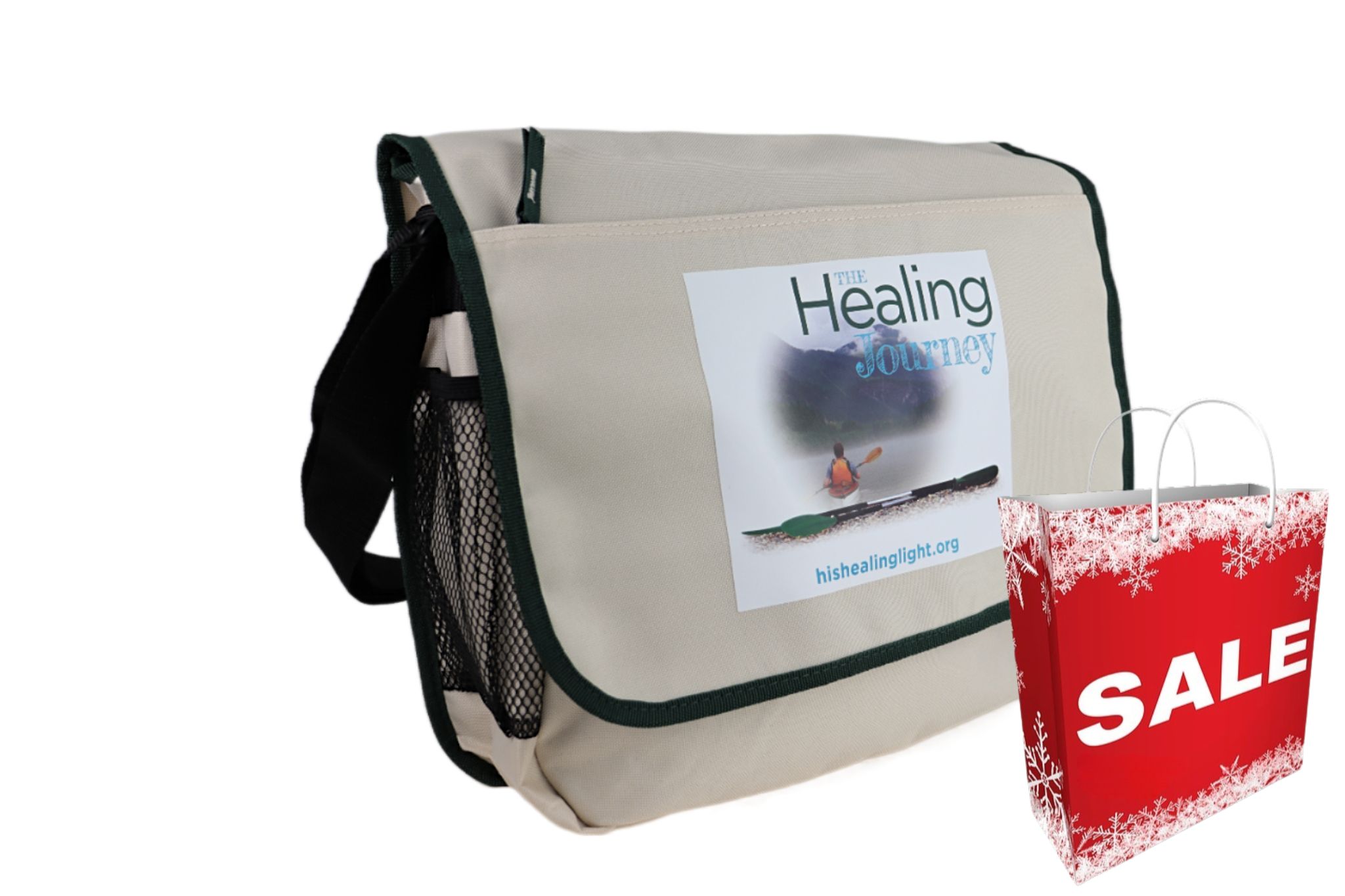 This messenger style bag features the men's Healing Journey logo, a large compartment, an area with different sized pouches, a pocket for phone or glasses, and a mesh area for a mug. The woven handle adjusts for carrying on the shoulder or across the body. 17" x 12" x 5" Washable